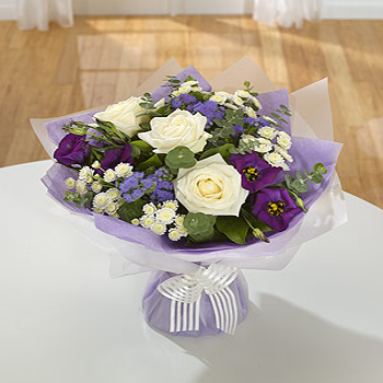 Mauves and creams are the star combination in this aqua pack hand-tied. Roses take the lead with Lisanthus and Chrysanthemums. Great for a Silver wedding gift.