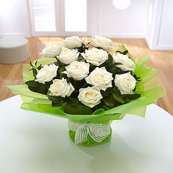One to treasure, a true celebration of beauty: twelve pearl-pinned white Roses.