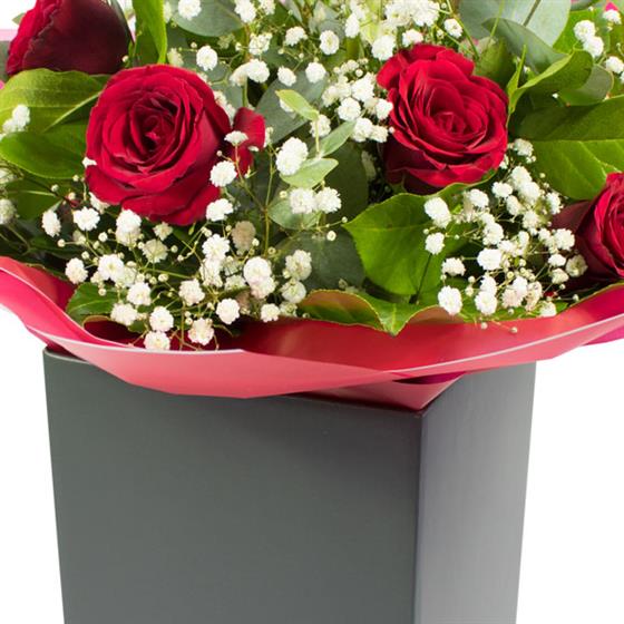 Simply gorgeous! An aqua pack of 6 large headed red Roses and Gypsophilla surrounded by lush, plump green foliages. Presented in complimentary wrapping and delivered in a van Wonderen Flowers gift bag