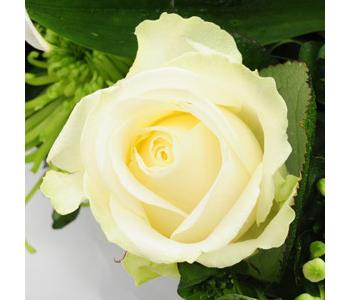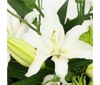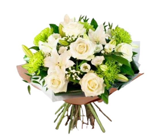 Blanche Elegante is a classic collection of white & green flowers. Featuring oriental Lilies, Roses, Lisianthus and striking lime green Anastcia Blooms. All beautifully combined with mixed foliages and presented in an environmentally friendly paper wrap. The bouquet is delivered in water in a stylish black van Wonderen Flowers presentation bag.