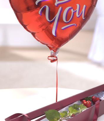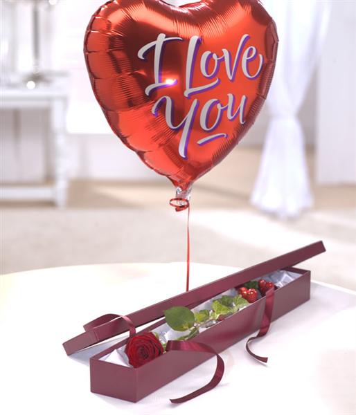 A traditional expression of love. A single red Rose with red hearts in an exquisite box set enhanced with an 'I Love You' balloon.