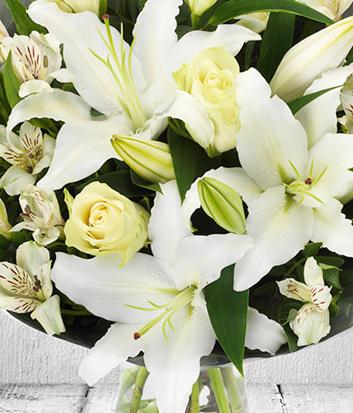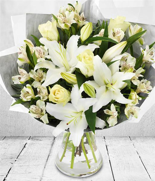 It's all white in this design. A delightful bouquet of white roses, white lilies and white alstroemeria.