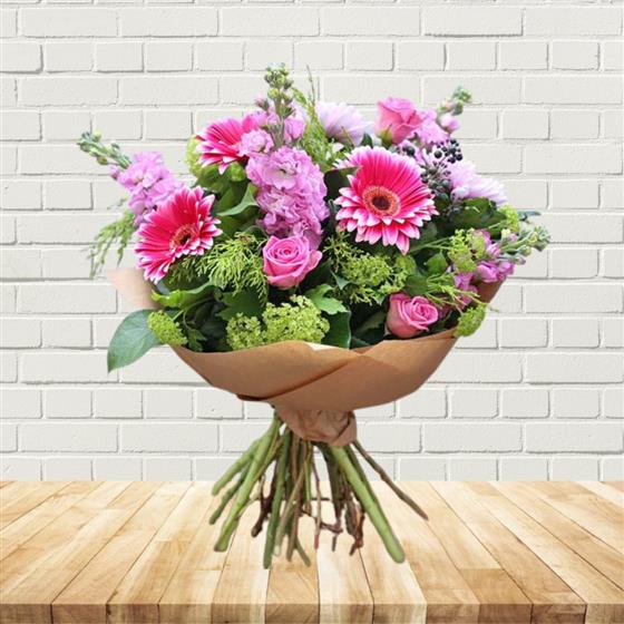 Matthiolas, Gerberas and Roses in shades of pink with complimentary filler foliages are used to create this bright and jolly bouquet