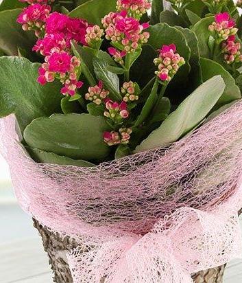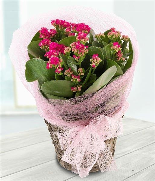 A very pretty pink Kalanchoe plant in a bark pot. A lovely present that's gift wrapped with a big bow.