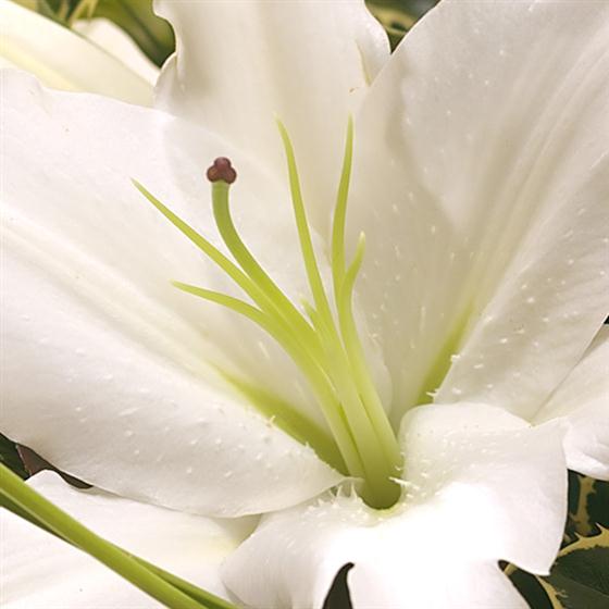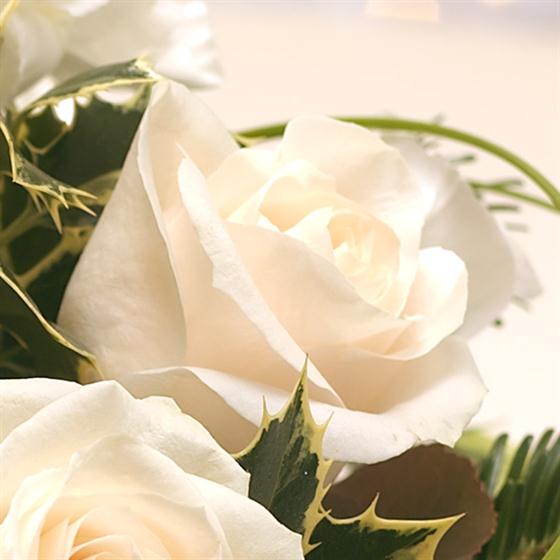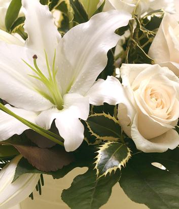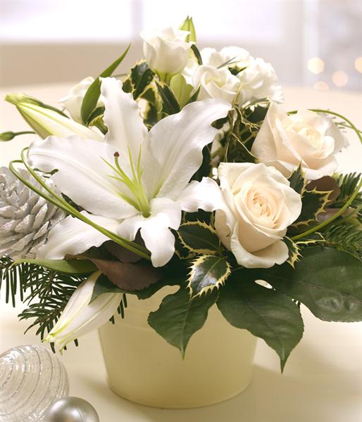 A fabulously fragrant Christmas flower arrangement. A beautiful white Lily is the star of the show, accompanied by crisp white Roses, Lisianthus and Carnations. White Pine Cones and winter foliage complete the look.