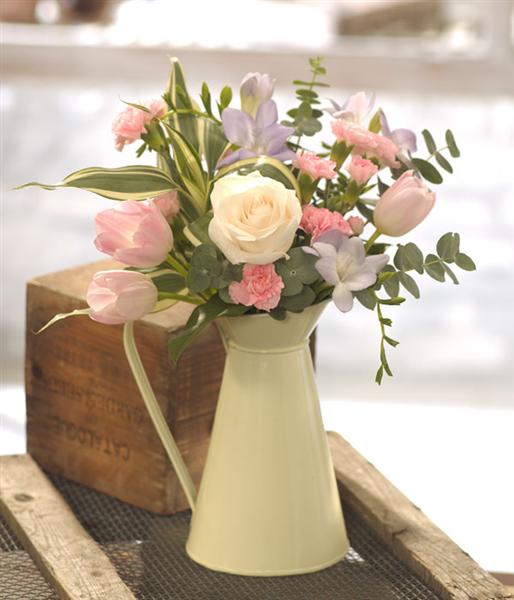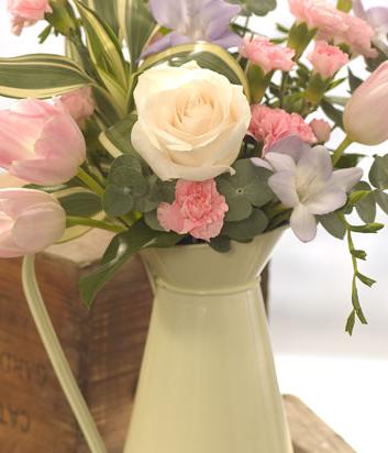 A jug full of delicate soft Spring flowers: Roses, Tulips and long lasting spray Carnations.