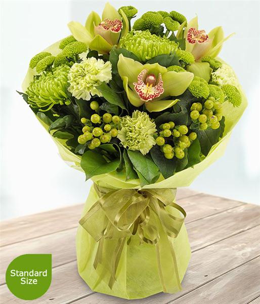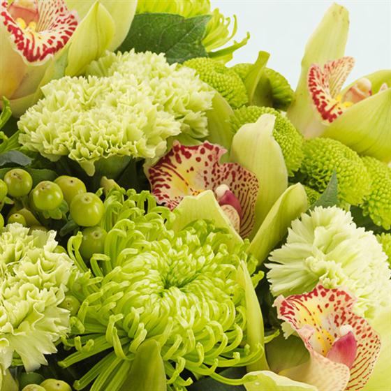 Green Cymbidium Orchid, Green Chrysanthemum, Green Spray Chrysanthemum, Green Carnation, Green Hypericum Berry, Salal.