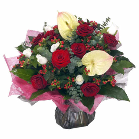 A large hand-tied flower bouquet with red Roses, Hypericum and Anthuriums. The bouquet comes beautifully packaged in an aquapack for instant display.