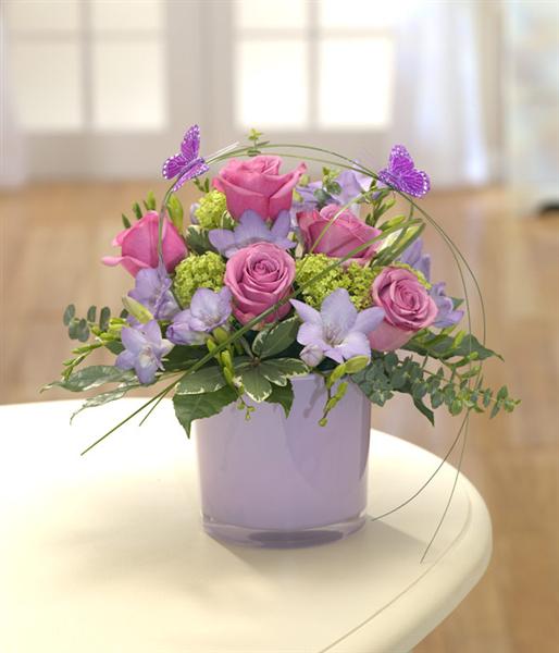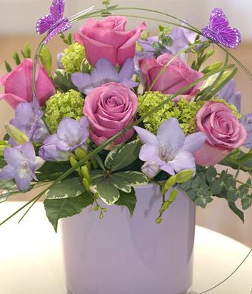 Beautiful pink Roses take centre stage in this compact fragrant container arrangement.