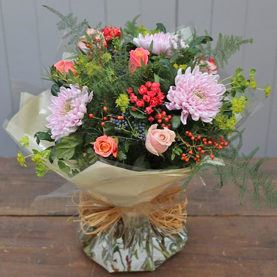 Wispy foliage and delicate blooms give this bouquet a just picked from the garden feel. Created using roses, bouvardia and single chrysanthemums.