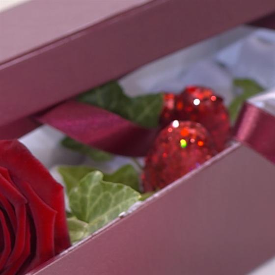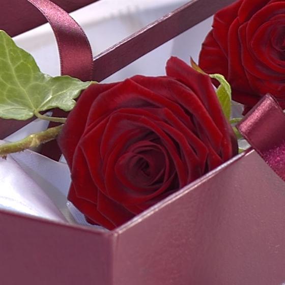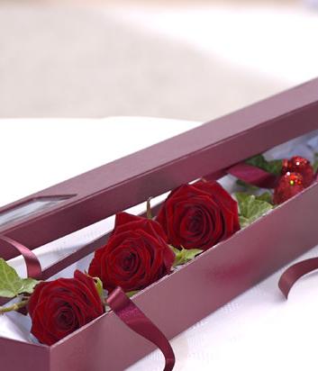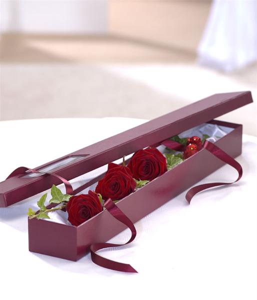 3 red Roses in a box to signify 'I love you'.