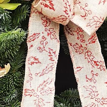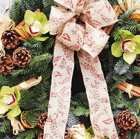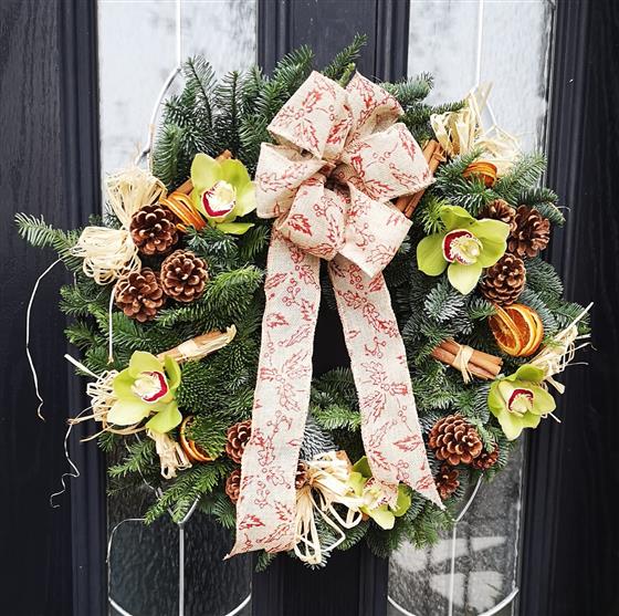 A contemporary pine backed door wreath adorned with fresh Cymbidium Orchids, Cinnamon, Pine Cones, Orange Slices, Raffia Bows and finished with a festive hessian bow with trails