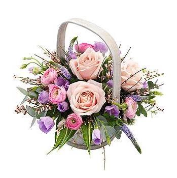 A pretty white wash basket arrangement containing pink roses with lavender Lisianthus and Veronica, pink Ranunculus and Genista (when in season).