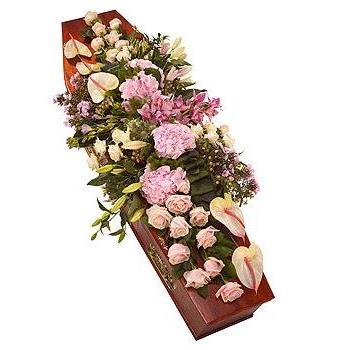 A pretty and delicately fragrant casket spray. Cream and pink Roses, pink Cymbidium Orchids, Hydrangea, Phlox, Lilies and Hypericum with purple Freesia and cream Anthuriums sit amongst a generous mix of Anthurium and Aspidistra leaves.