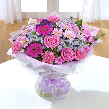 A classic pink and purple hand-tied featuring Roses, Germini, spray Carnations, Chrysanthemums, Lisianthus and September Flower.