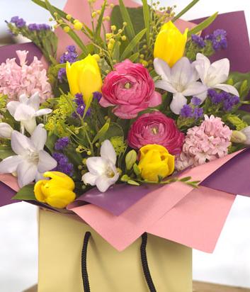 An explosion of colour in this fragrant posy: fragrant Freesia, Hyacinth and Mimosa enhanced with Ranunculus, Tulips and Statice.