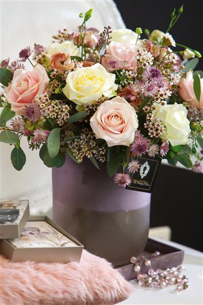 An alluring selection for someone special. This stunning bouquet of pale pink and white Avalanche Roses combined with delicate Astrantia, Waxflower, Lisianthus and greens. Presented in a gift bag, ready to be placed straight into a vase.