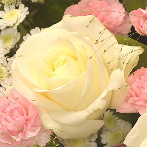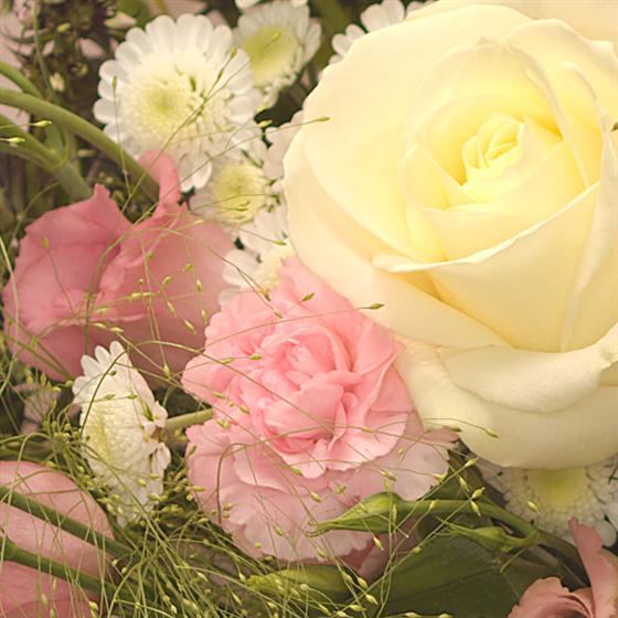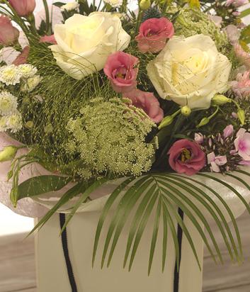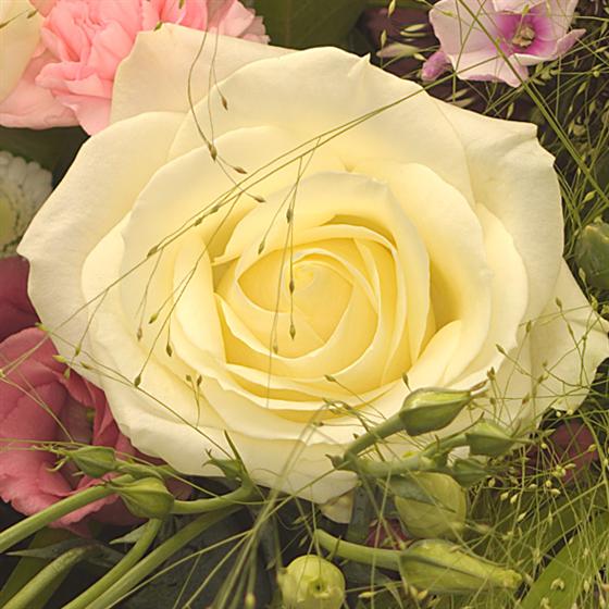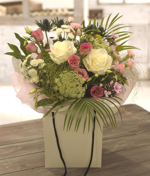 This hand-tied bouquet, aqua packed for freshness, has a soft, flowing feel of summer. The delicately fragranced Phlox and stunning Roses are surrounded by Lisianthus, spray Chrysanthemums, spray Carnations, Eryngium and white Dill flowers.