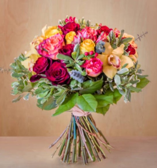 A carnival mixture of coloured Roses combined with Cymbidium Orchids, finished with some delicate foliages
