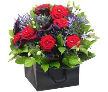 Ruby Amore is a true expression of love, designed with the most luxurious Red Roses, blue Agapanthus and beautiful Eustoma flower. Further luxury comes in the form of black Calla Lilies, interspersed with blue Thistles, after which the whole arrangement is edged with folded aspidistra and embraced by a luxurious wrap and presented in a van Wonderen Flowers gift bag.