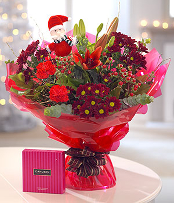 A bright bouquet of rich reds and Santa! We've added a box of 9 Danucci Milk Chocolates to make this a lovely Christmas flower gift.