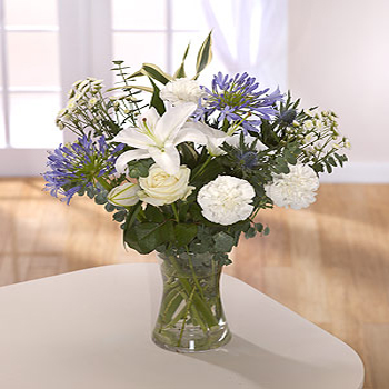 This appealing bouquet features white Lilies, Roses and Chrysanthemums, highlighted with blue Agapanthus and Eryngium.