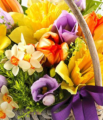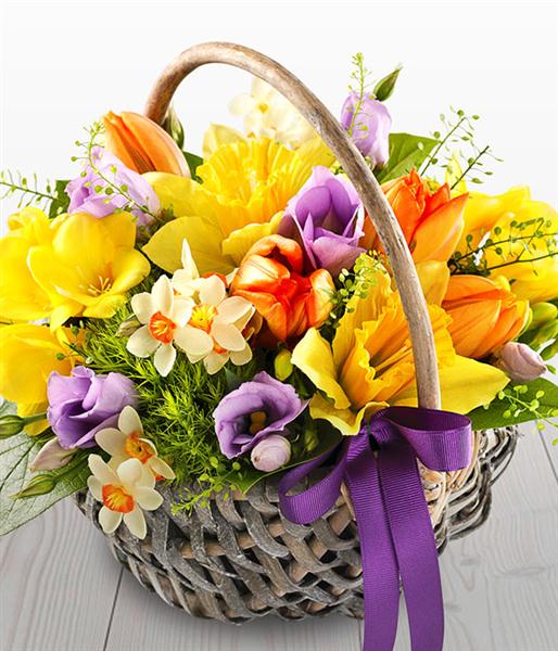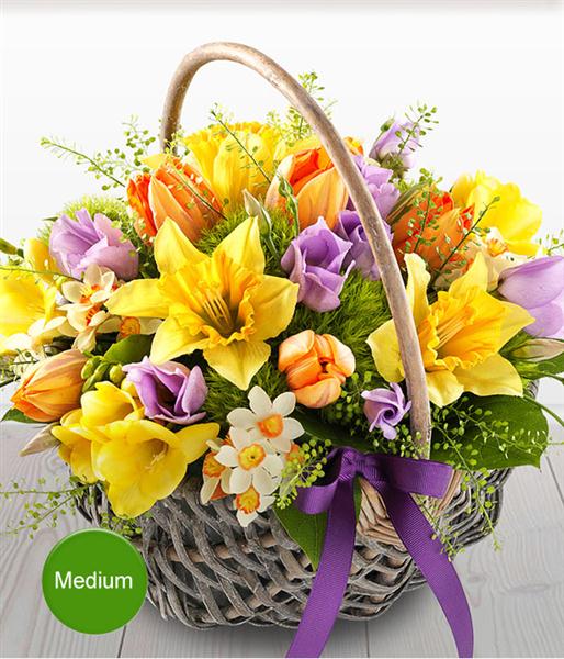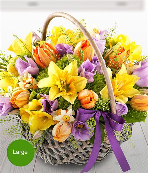A wonderfully bright and delicately fragrant spring flower Basket featuring Daffodils, Freesia, Tulips, Lisianthus, Narcissi and Sweet William.