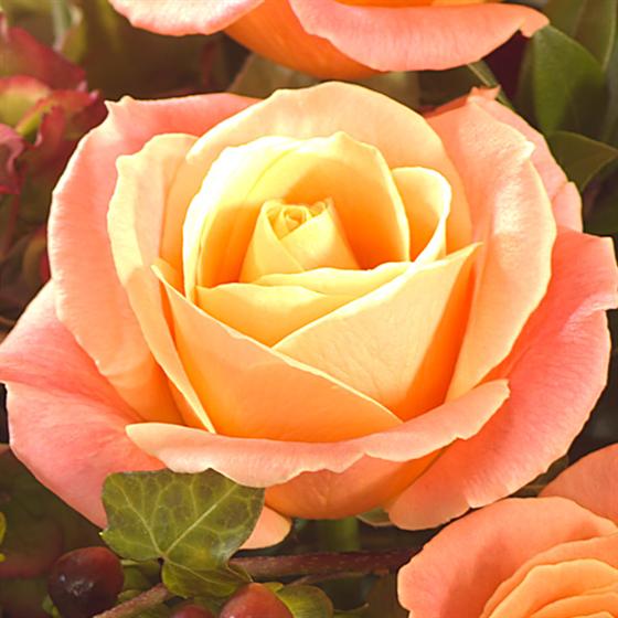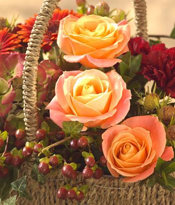 A simply gorgeous autumnal flower basket arrangement in rich reds and rustic oranges. Roses, Hydrangea, Freesia, Germini, Carnations and Hypericum berries.