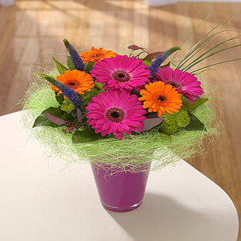 This contemporary design is bursting with vibrant orange and pink Gerbera and framed with a zesty lime green collar. Blue Veronica and Bear Grass add distinction to this elegant arrangement.