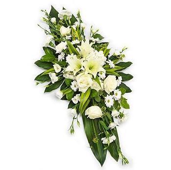 A timeless classic tribute. This white double ended spray features white Roses, Lilies, Lisianthus, Chyrsanthemums and Carnations. All arranged with a selection of complimenting foliages.
